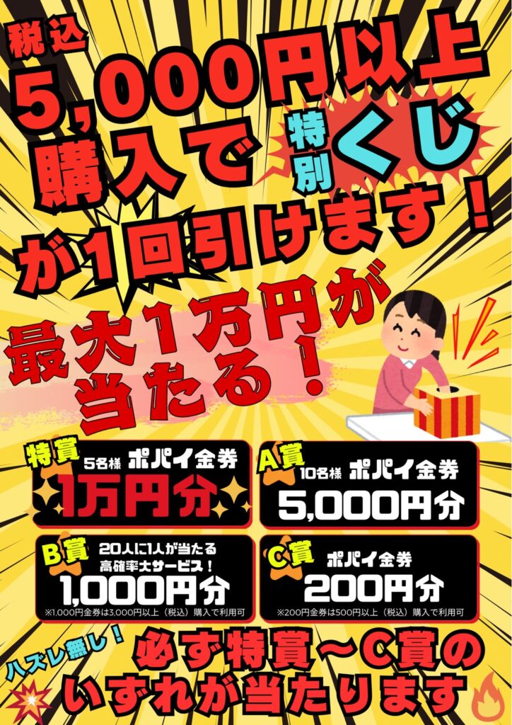 期間中5,000円のお買い物ごとに金券くじをお選びいただけます!