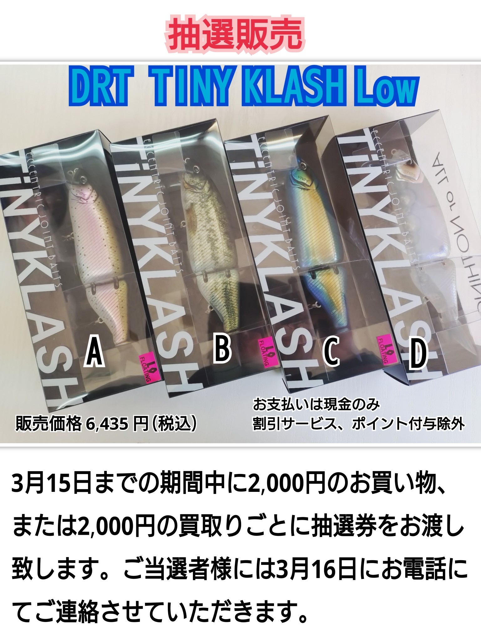もしくは2,000円の釣具の買い取りごとに1枚抽選券を差し上げます。